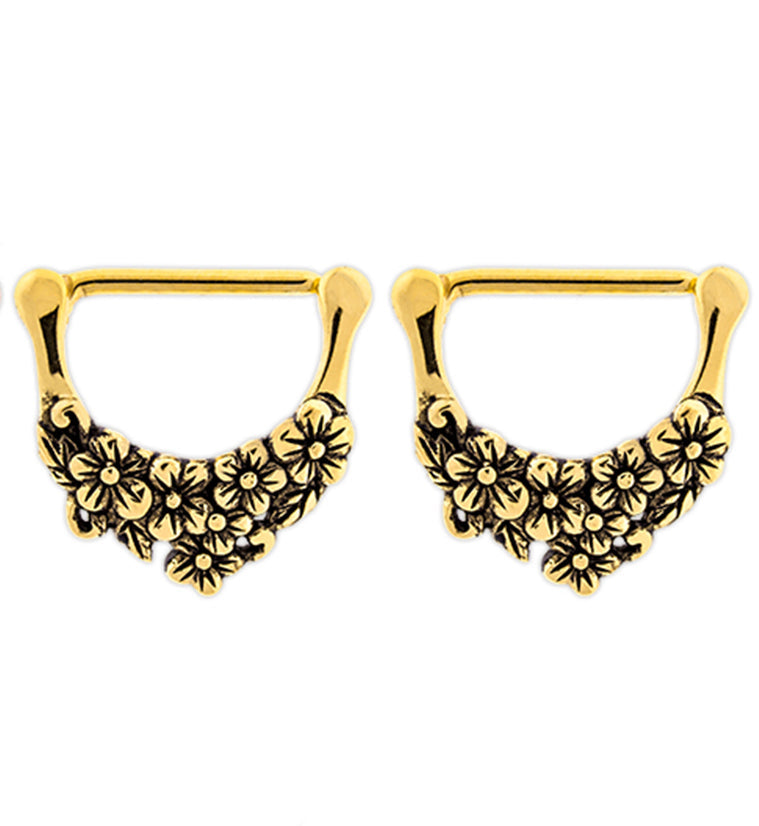 Embody tropical vibes with our gold botanic nipple rings! The standard 14g straight barbell is constructed from 316L stainless steel with flashy gold PVD coating. Featuring 9/16” wearable area and simple clicker closure. Measures ¾” by 13/16” including sculpted floral design. Intended for healed piercings only and sold as a pair.