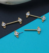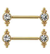 Beautiful nipple ring barbells with a threadless design. Made from gold pvd on 316L stainless steel and a sparkling cz gem on either side, decorated with clusters of beads. The threadless design makes for easy insertion and removal. Size is 14G with an inner barbell length of 9/16" (14mm). Sold in pairs (2pcs). For healed piercings.
