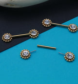 Sparkling threadless nipple ring barbells made from gold pvd on 316L stainless steel and stunning clear cz gems. Size is 14G with an inner length of 9/16" (14mm). Sold in pairs (2pcs). For healed piercings.