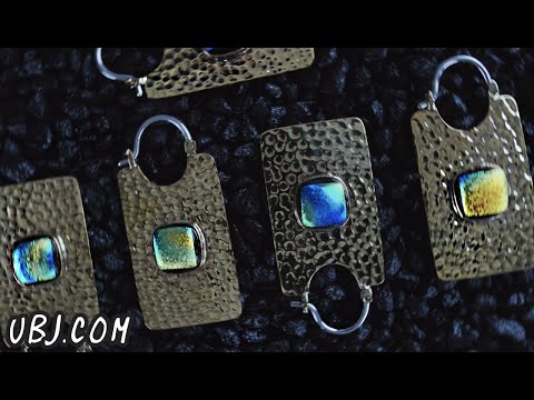Sold in pairs (2pc) Size: 14G Width: 28mm Height: 55mm 8.5 grams each Made from brass Sterling silver clasp Purple dichroic glass setting Silver is not meant for long term wear May oxidize under extreme moisture conditions