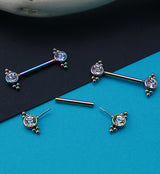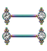 Beautiful nipple ring barbells with a threadless design. Made from rainbow pvd on 316L stainless steel and two sparkling cz gems. The threadless design makes for easy insertion and removal. Size is 14G with an inner barbell length of 9/16" (14mm). Sold in pairs (2pcs). For healed piercings.