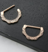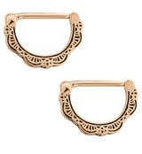 Add some pretty decor with these nipple rings! The standard 14g straight barbell is constructed from 316L stainless steel with a rose gold PVD coating. Featuring 9/16” wearable area and easy clicker closure. Measures 15mm by 20mm. Designed for healed piercings only and sold as a pair.