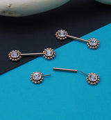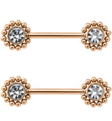Classic nipple ring barbells made from rose gold pvd on 316L stainless steel and two sparkling cz gems. Threadless design makes for easy insertion and removal. Size is 14G with an inner length of 9/16" (14mm). Sold in pairs (2pcs). For healed piercings.