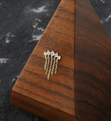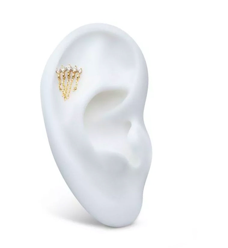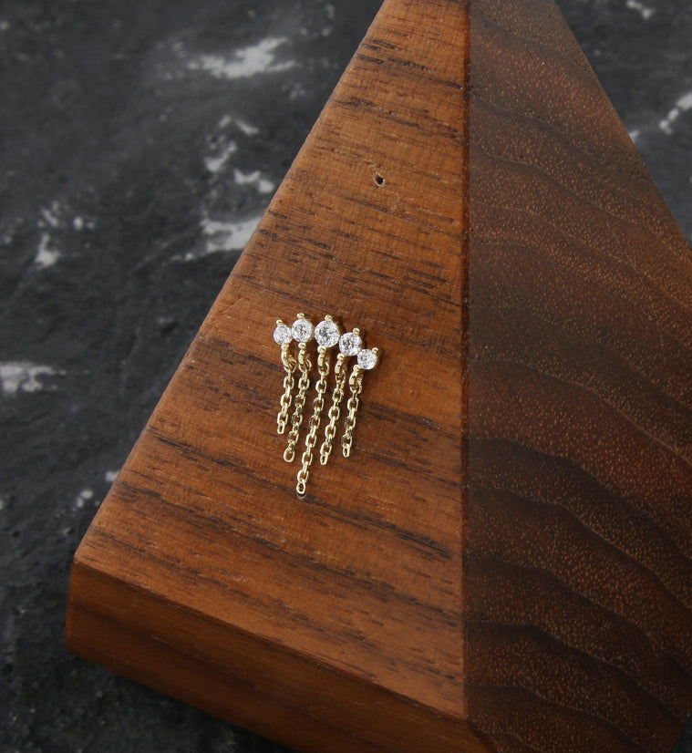 Threadless top piece that has a curved clear cz gem design that is accented with five dangling chains. Fits all threadless posts. Made from 14kt nickel-free gold with a 316L stainless steel pin. Length is approximately 5mm. Top size: 8.6mm x 1.6mm. Sold individually (1pc, top only).