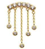 Fun threadless top piece with an arch design that is filled with clear cz gems and has five dangling chains with cz gems attached at the end. Made from 14kt nickel-free yellow gold. Fits all threadless posts. Made from 14kt nickel-free gold with a 316L stainless steel pin. Pin size is 25G. Length is approximately 6mm. Size is about 21mm x 13.5mm. Sold individually (1pc, top only).