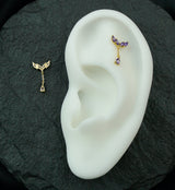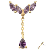 Threadless top piece that has a v-shape and is accented with amethyst cz gems. Attached is a dangling, teardrop amethyst cz gem. Made from 14kt nickel-free yellow gold with a 316L stainless steel pin. Pin size is 25G. Length is approximately 5mm. Top size measures 13mm x 8mm. Sold individually - top only.