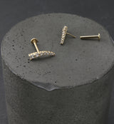 Threadless labret with an ascending design filled with clear cubic zirconia gems. Made from 14kt gold. Disk size is 3mm. Choose your gauge: 18G or 16G. Length is 5/16" (8mm). Sold individually (2 pieces - top and bottom). For healed piercings.
