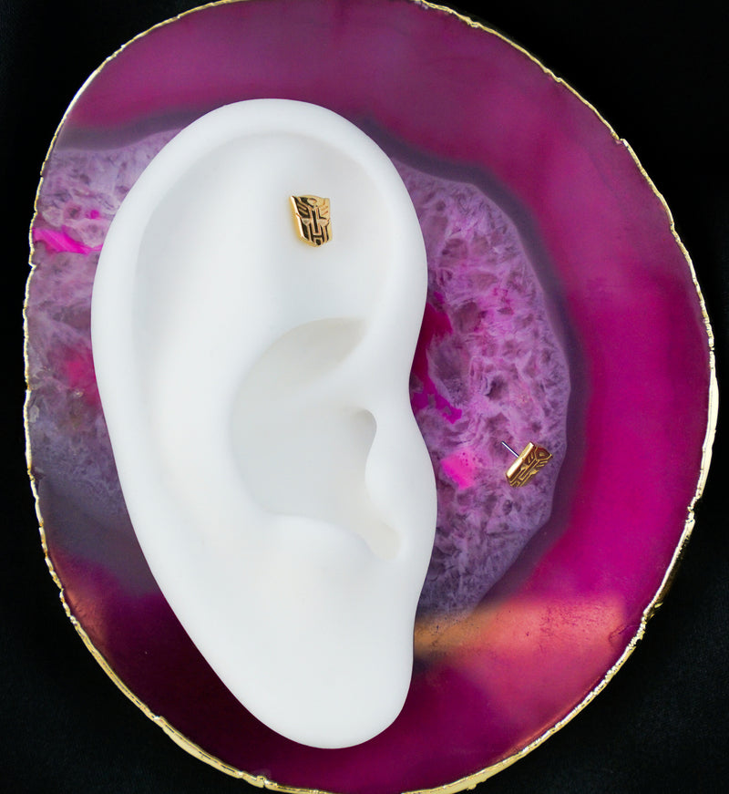 This threadless top piece is a cool option to add to your collection. It features a Transformers Autobot logo design. Total design measures about 6mm x 6mm. Top made from 14kt nickel-free gold with a 316LVM ASTM F-138 5mm stainless steel pin. Sold individually (1 piece - top only).