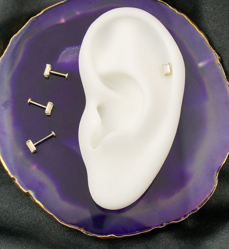 This 14kt gold labret features a 2mm, flat disk back and a stunning, baguette, clear cz gem on top. The gem measures at 4.5mm x 3.5mm. It is available in 20G with a 1/4" (6mm), 9/32" (7mm) or 5/16" (8mm) wearable length to choose from. The threadless design has an effortless, push pin closure. Sold individually.
