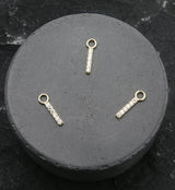Jewelry charm shaped like a bar shape that is filled with six, clear cz gems. Made from 14kt nickel-free yellow gold. Match this charm with different size hoops and hinged segment clickers for a unique look! Small, versatile piece for a variety of piercings. Great for a curated ear look. O-ring size: 0.8mm (thick) x 2mm (inner diameter) x 3.6mm (outer diameter). Charm size is 1.5mm x 9mm. Sold individually (1pc).
