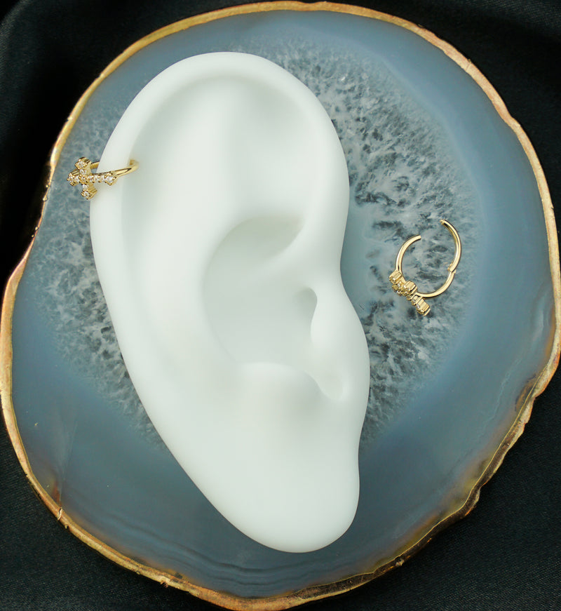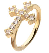 14kt gold hinged segment ring that has an antique-looking cross that is accented with clear cz gems. Made from high quality 14kt gold. Hinged style makes for easy to put in and remove. Size is 16G with an inner diameter size of 5/16" (8mm). Sold individually (1pc).