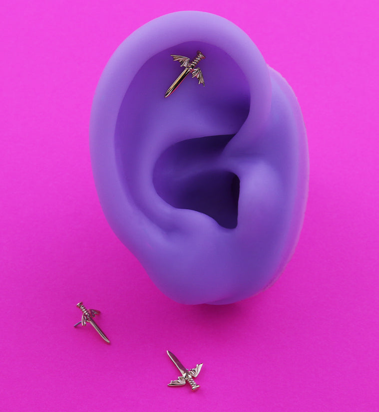 Shining threadless top piece that has a dagger design with bat wings attached. Fits all threadless posts. Made from 14kt nickel-free gold with a 316LVM ASTM F-138 implant grade steel pin. Length is approximately 5mm. Top size: 11mm x 9mm. Sold individually (1pc, top only).