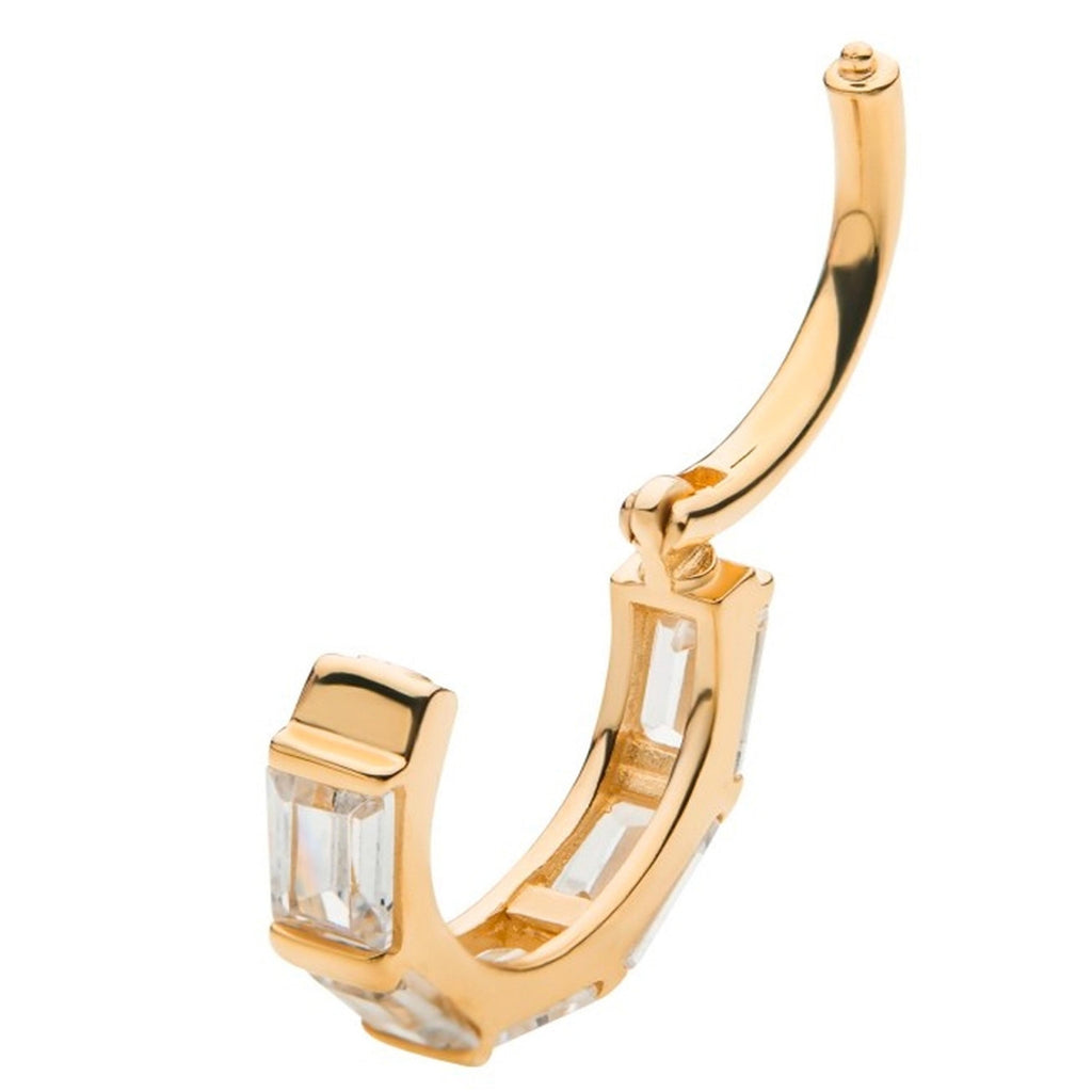 Dress up your piercings with our 14kt Gold Bauble Hinged Segment Ring! Made with 14kt solid gold and featuring clear CZ gems, this ring will add a touch of sparkly to any look. The hinged design ensures a secure and comfortable fit, making it the perfect addition to your jewelry collection.