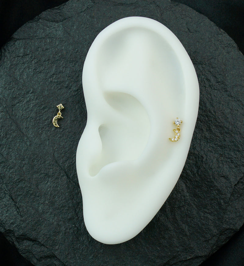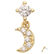 Threadless top piece that has a prong set, clear cz gem with a beaded, crescent moon dangling accent. The cz gem on top measures 2mm. Made from 14kt nickel-free gold with a 316L stainless steel pin. Pin size is 25G. Length is approximately 5mm. Top size measures 8.5mm x 3.2mm. Sold individually (top only).