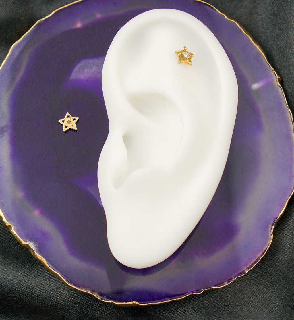 Threadless top piece that has cute, beaded star outline that has a centered, clear cz gem. Fits all threadless posts. Made from 14kt nickel-free gold with a 316L stainless steel pin. Pin size is 25G. Length is approximately 5mm. Top size measures around 6mm x 5.8mm. Sold individually (1pc-top only).