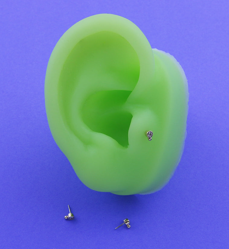 Sparkling threadless top piece that has a round, bezel cz design and an accented bead underneath. Fits all threadless posts. Made from 14kt nickel-free gold with a 316LVM ASTM F-138 implant grade steel pin. Length is approximately 5mm. Top size: 3.8mm x 1.8mm. Sold individually (1pc, top only).