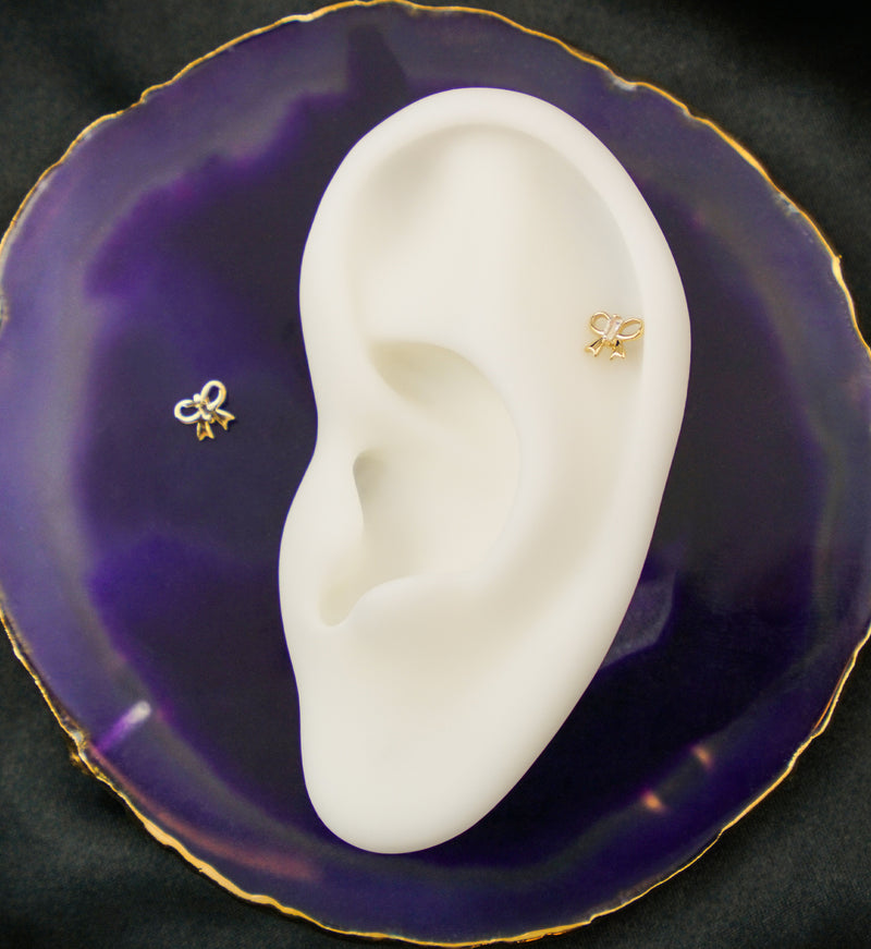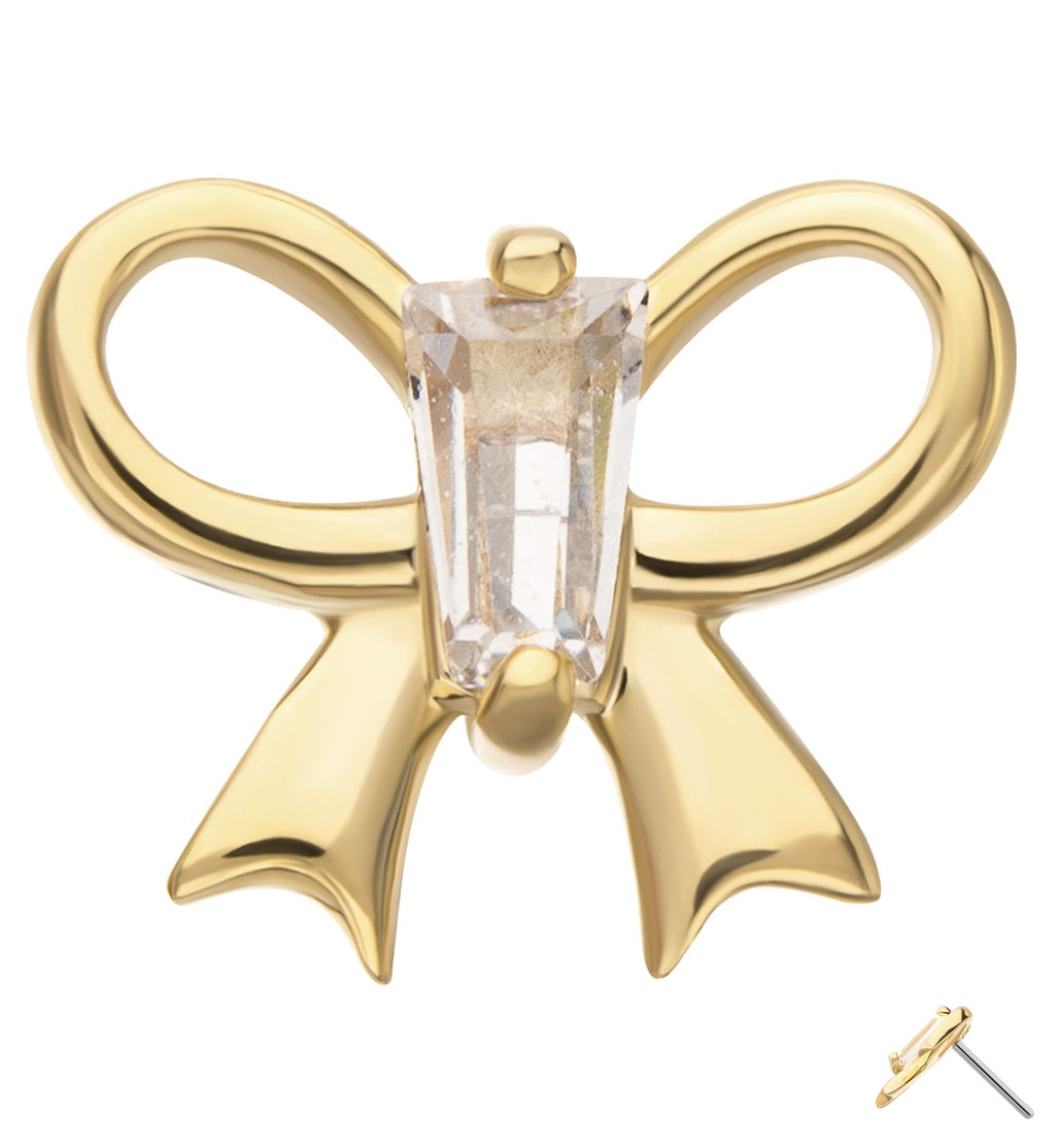 Threadless 14kt nickel-free gold top piece that has a cut out bow shape that has a baguette, clear cz gem in the center. Pin size is 25G and fits most threadless posts. The size is about 6mm x 5.1mm. Cute threadless top to add to your cartilage or tragus piercing! Sold individually (top only).