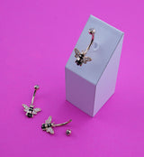 Beautiful, golden belly button ring made from 14kt nickel-free gold. It consists of a bumblebee design made with black enamel and clear cz gems on the wings. Gem top is 4mm on top and 14mm bottom design. Size is 14G with a 7/16" 11mm barbell. Internally threaded. Sold individually (1 pc). For healed piercings.