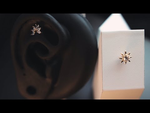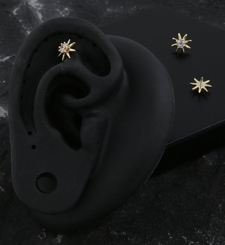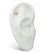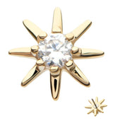 Threadless top piece that has a sunburst design with a centered cz gem. Fits all threadless posts. Made from 14kt nickel-free gold with a 316L stainless steel pin. Length is approximately 5mm. Top size: 7.9mm x 7.9mm. Sold individually (1pc, top only).