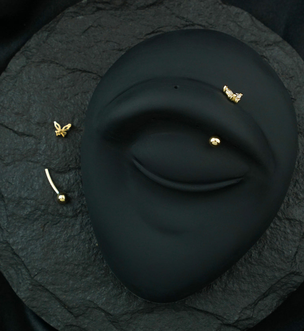 Curved barbells decorated with a butterfly cz design on top. The top piece has a threadless design that makes it effortless to insert and remove. The top design measures 5mm. Made from 14kt yellow gold with an inner length of 5/16" (8mm) and a 16G size. Complete with a 3mm ball on the end. Sold individually. Cute jewelry piece for your eyebrow or rook piercings!