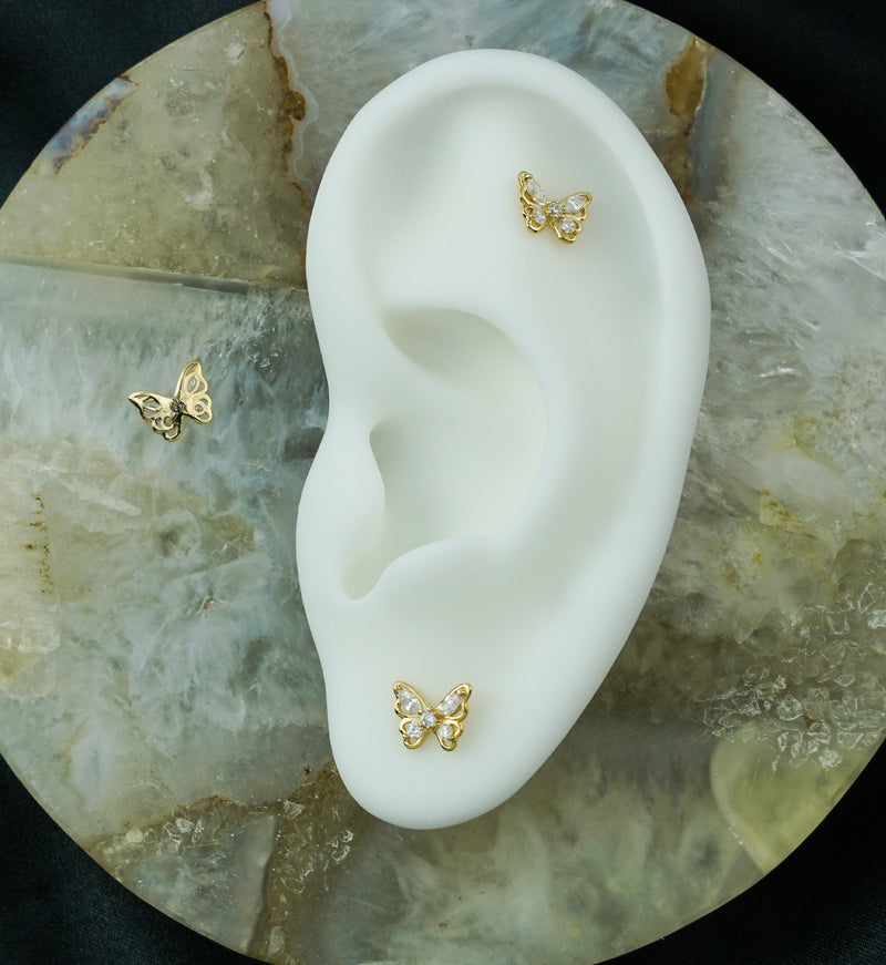 This 14kt Gold Butterfly Frame Clear CZ Threadless Top is a versatile and stylish addition to any piercing. Made with 14kt nickel-free gold and a 316L stainless steel pin, this top is high-quality. Its clear CZ gems add a touch of sparkle and its 6.3mm x 7.8mm size makes it perfect for cartilage or tragus piercings. Sold individually.