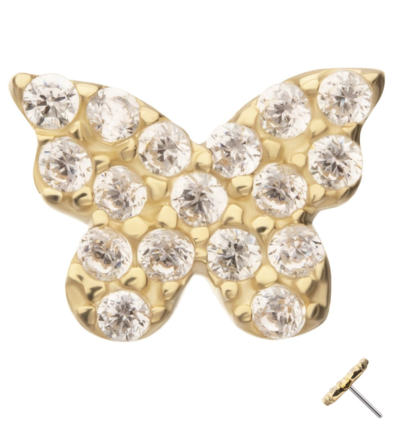 14kt nickel-free gold threadless top piece that has a butterfly design that is filled with pave-set, clear cz gems. Pin size is 25G and fits most threadless posts. The size is about 7mm x 5mm. Pretty threadless top to add to your cartilage or tragus piercing! Sold individually (top only).
