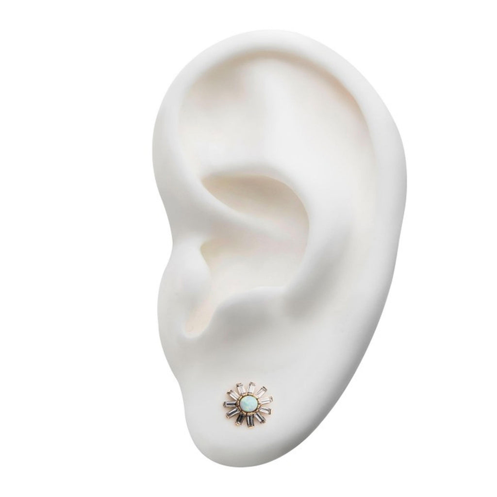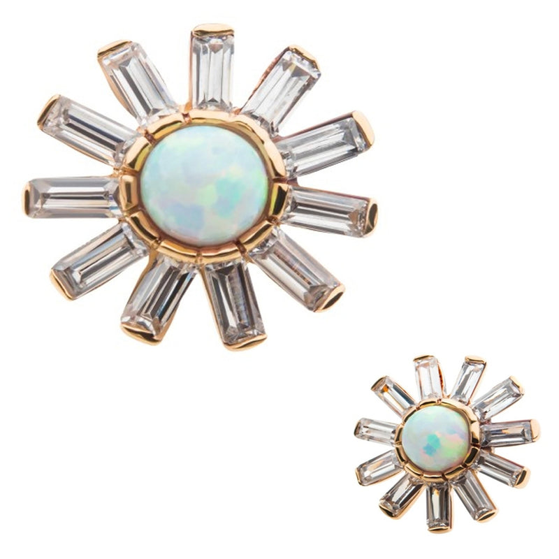 Sold individually (1 piece - top only) 14kt gold Threadless Size: 8.5mm x 8.5mm Synthetic opalite Cubic zirconia gems 316LVM stainless steel pin Designed to fit the barbells/labrets below Threadless Labret Threadless Barbell