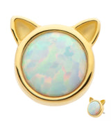 Threadless top piece that has a bezel set round synthetic white opal gem in a cat head shape. Fits all threadless posts. Made from 14kt nickel-free gold with a 316L stainless steel pin. Pin size is 25G. Pin length is approximately 4.5mm. Size is about 5.5mm x 5.5mm. Sold individually (1pc, top only).