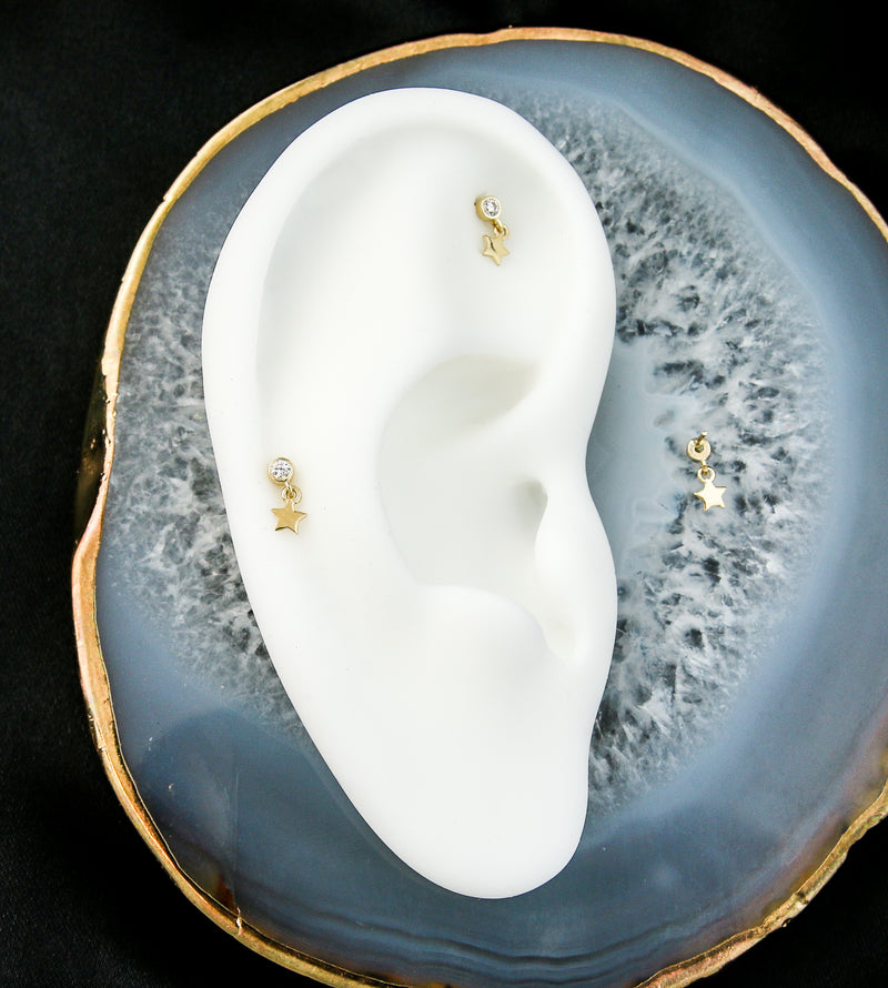 This 14kt Gold Celestial Star Dangle would make the perfect staple piece. Threadless top piece that has a dangling celestial star design that measures about 3mm x 3mm. This threadless top also features a 2mm clear cz. Fits all threadless posts. Made from 14kt nickel-free gold with a ASTM F-136 titanium pin. Total size: 7mm x 3mm (including dangling moon). Pin size is 25G. Pin length is approximately 4mm. Sold individually (1pc, top only).