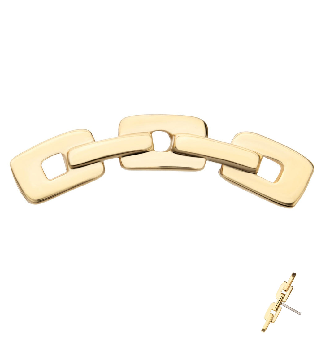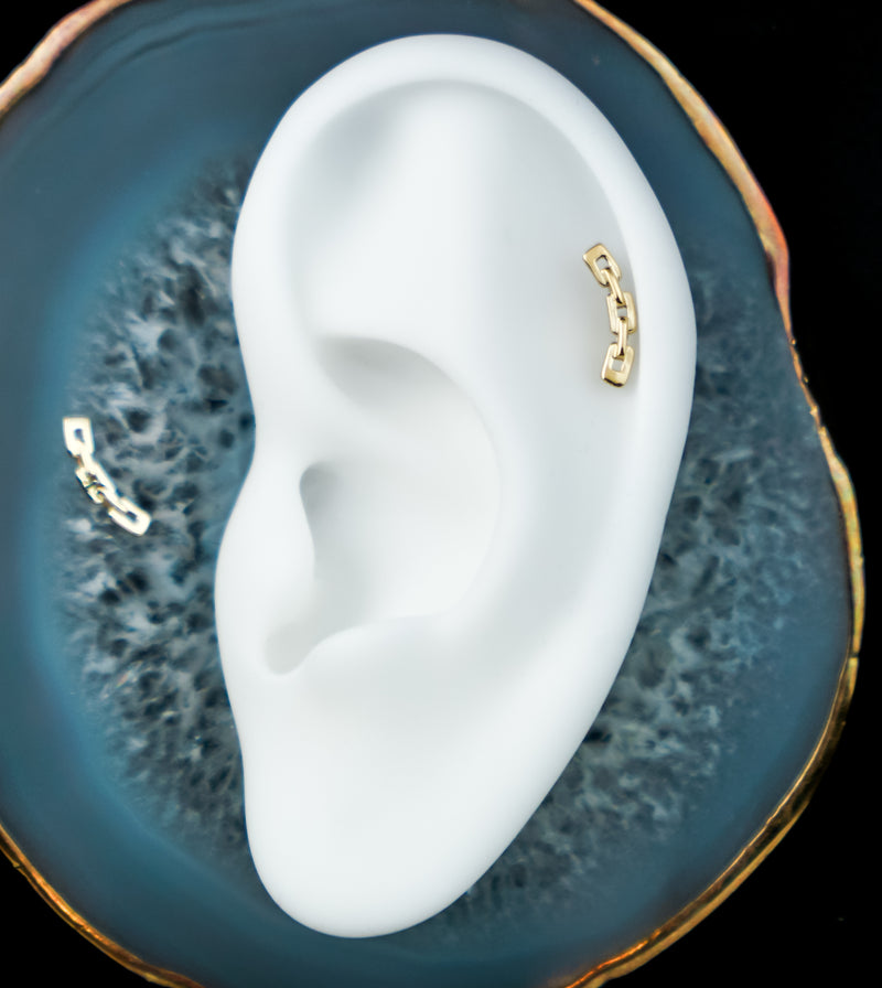 This threadless top piece has a curved chain design that would make a cool addition to your piercings. The full design measures about 12mm x 3.5mm. This jewelry piece is made with 14kt nickel-free gold with a 316LVM ASTM F-138 5mm stainless steel pin. Edgy jewelry choice for a variety of ear piercings! Sold individually (1pc).