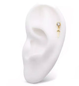 Threadless top piece that has a 4mm bezel set clear cz gem with an attached, dangling dagger design. Fits all threadless posts. Made from 14kt nickel-free gold with a 316L stainless steel pin. Length is approximately 5mm. Top size: 15.5mm x 4mm. Sold individually (1pc, top only).