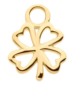 Jewelry charm shaped like a 4-leaf clover. Made from 14kt nickel-free yellow gold. Match this charm with different size hoops and hinged segment clickers for a unique look! Small, versatile piece for a variety of piercings. Great for a curated ear look. O-ring size: 0.8mm (thick) x 2mm (inner diameter) x 3.6mm (outer diameter). Charm size is 8mm x 8mm. Sold individually (1pc).