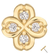 Accentuate your cartilage or tragus piercings with our 14kt Gold Clover Clear CZ Threadless Top. Made of 14kt nickel-free gold and featuring a 316L stainless steel pin, this top piece has a four leaf clover design and is accented with clear cz gems. The clear CZ gems add a touch of elegance and the whole top measures 6mm x 6mm in size. Sold individually.
