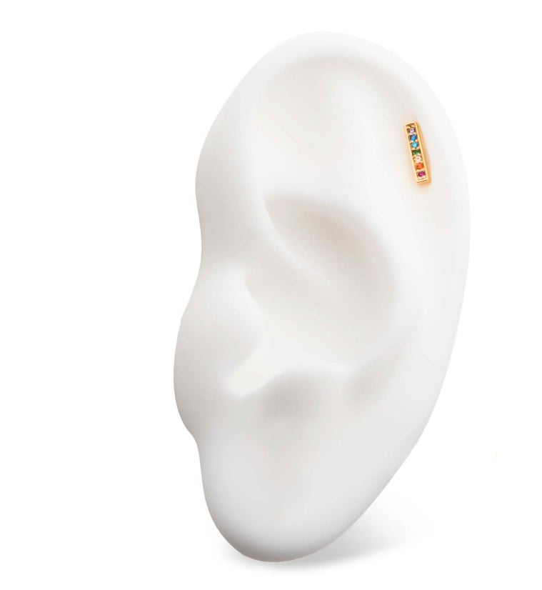 Threadless top piece with a long, bar shape filled with several colorful cubic zirconia gems. Made from 14kt nickel-free gold with a 316LVM stainless steel pin. Size is approx. 9mm x 2mm. Sold individually (1pc, top only).