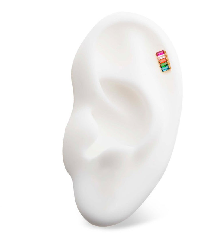 Threadless top piece with a row of sparkling, baguette-shaped cz gems in rainbow colors. Made from 14kt nickel-free gold with a 316LVM stainless steel pin. Size is approx. 7.9mm x 4.1mm. Sold individually (1pc, top only).