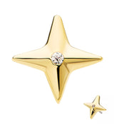 Threadless top piece that has a compass star design with a sparkling, clear cz gem in the middle. Fits all threadless posts. Made from 14kt nickel-free gold with a 316L stainless steel pin. Pin size is 25G. Length is approximately 6mm. Top size is about 6.5mm x 6.5mm. Sold individually (1pc, top only).