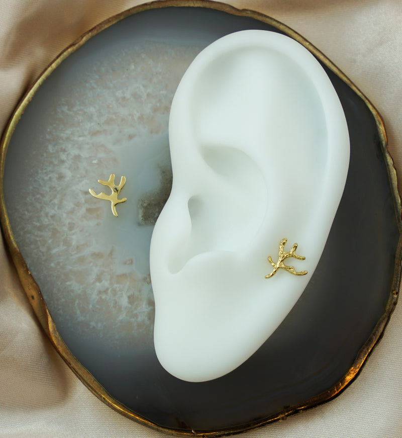Threadless top piece that has a coral branch design that is textured and polished. This jewelry piece is made with 14kt nickel-free gold and a 316LVM ASTM F-138, 5mm stainless steel pin. Beautiful threadless jewelry for a variety of ear piercings! Sold individually (1pc - top only).