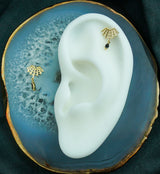 14kt nickel-free gold threadless top piece that has a corner spiderweb design that is accented with an attached, dangling, oval, black cz gem. Pin size is 25G and fits most threadless posts. The size is about 14mm x 10mm (including dangle). Edgy top to add to your cartilage or tragus piercing! Sold individually (top only).