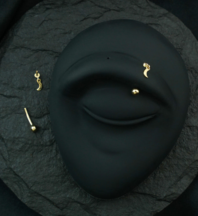 Curved barbells decorated with a dangling, crescent moon design and a bezel cz gem on top. The top piece has a threadless design that makes it effortless to put in and remove. The top design measures 7mm x 2mm (including star dangle). Made from 14kt gold with a 16G size and an inner length of 5/16" (8mm). Complete with a threadless 3mm ball on the end. Sold individually. Celestial jewelry piece for your eyebrow or rook piercings!