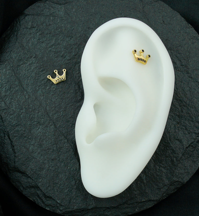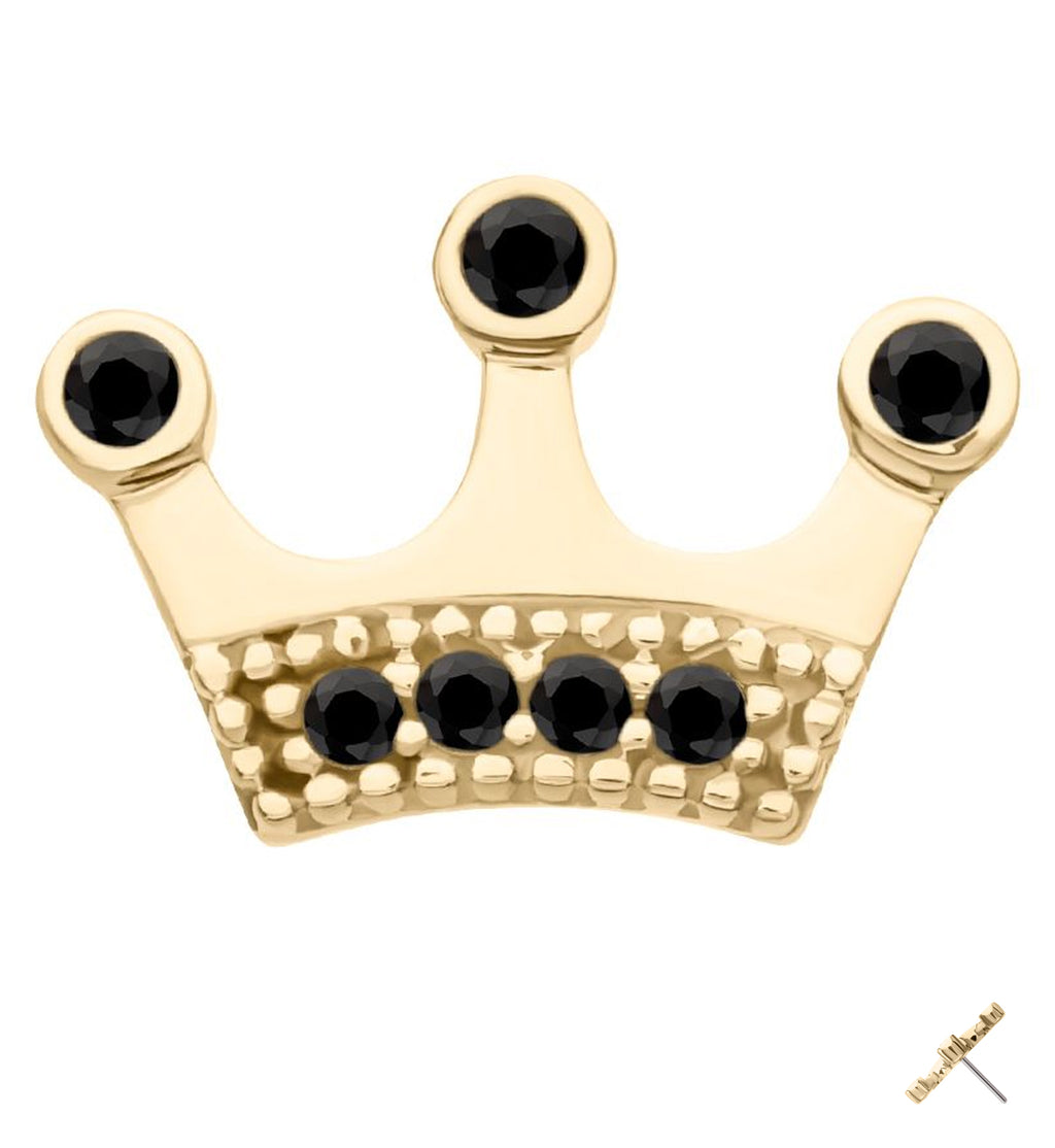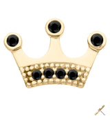 Threadless top piece that has a crown shape and is accented with black cz gems. Created from 14kt nickel-free gold with a 316L stainless steel pin that measures 25G. Length is approximately 5mm. Top size measures at 8.8mm x 6mm. Sold individually (top only).