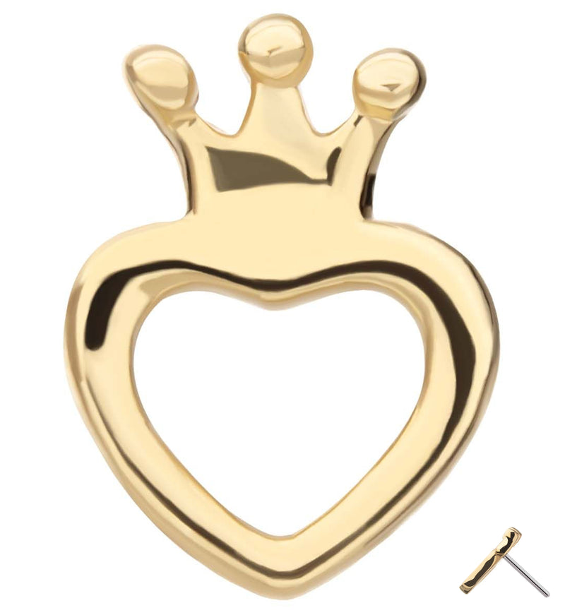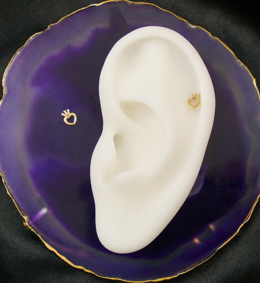 Threadless 14kt nickel-free gold top piece that has a cut out heart shape that has a crown on top. Pin size is 25G and fits most threadless posts. The size is about 6mm x 4.5mm. Royal threadless top to add to your cartilage or tragus piercing! Sold individually (top only).