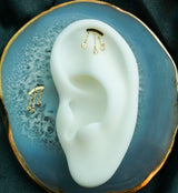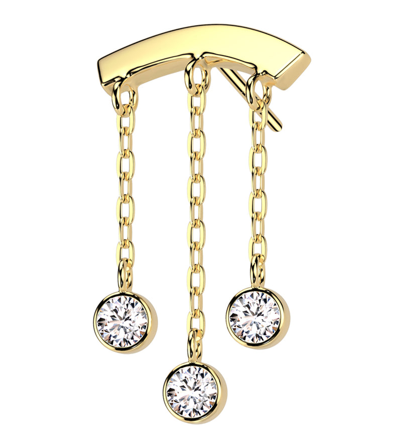 14kt nickel-free gold threadless top piece that has a curved bar design that has three dangling, bezel-set, clear cz gems attached. The gems measure about 1.5mm each. Pin size is 25G and fits most threadless posts. The size is about 13mm x 8mm. Dangling top to add to your cartilage or tragus piercing! Sold individually (top only).