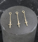 Jewelry charm with a dangling chain and a dagger design at the end, the handle of which is filled with clear cz gems. Total length is about 28mm. Match this charm with different size hoops and hinged segment clickers for a unique look! Small, versatile piece for a variety of piercings. Great for a curated ear look. O-ring size: 0.63mm (thick) x 2.4mm (inner diameter) x 3.7mm (outer diameter). Sold individually (1pc).