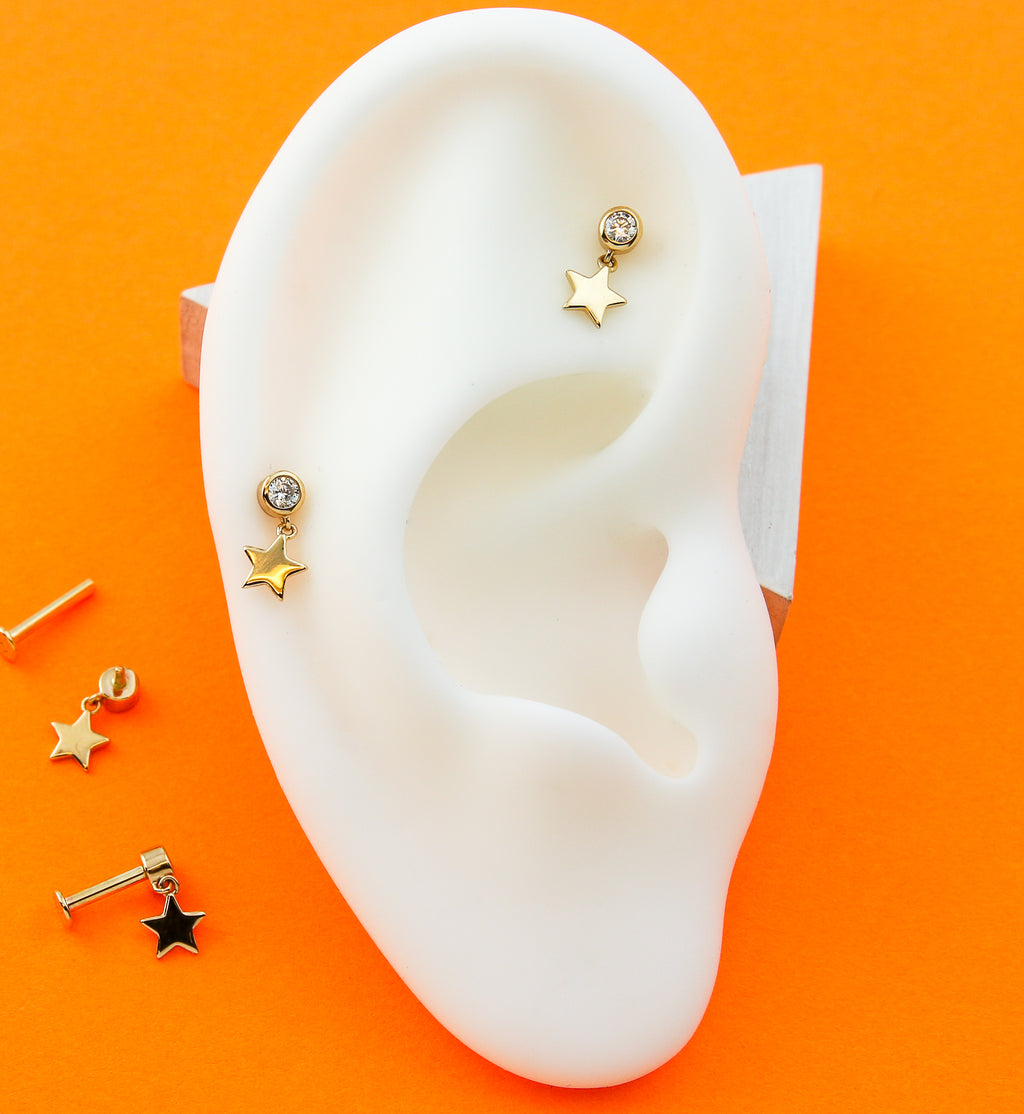 Expertly crafted with 14kt yellow gold and a sparkling clear CZ gem, this labret is perfect for adding a touch of dangle to any piercings. With an internally threaded design, these pieces are easy to insert and offer a comfortable fit. Available in 16G with various lengths and a 3mm disk size, each piece features a dangle star design measuring 9mm x 5mm for a subtle yet elegant look. Great for cartilage or tragus piercings! Sold individually.