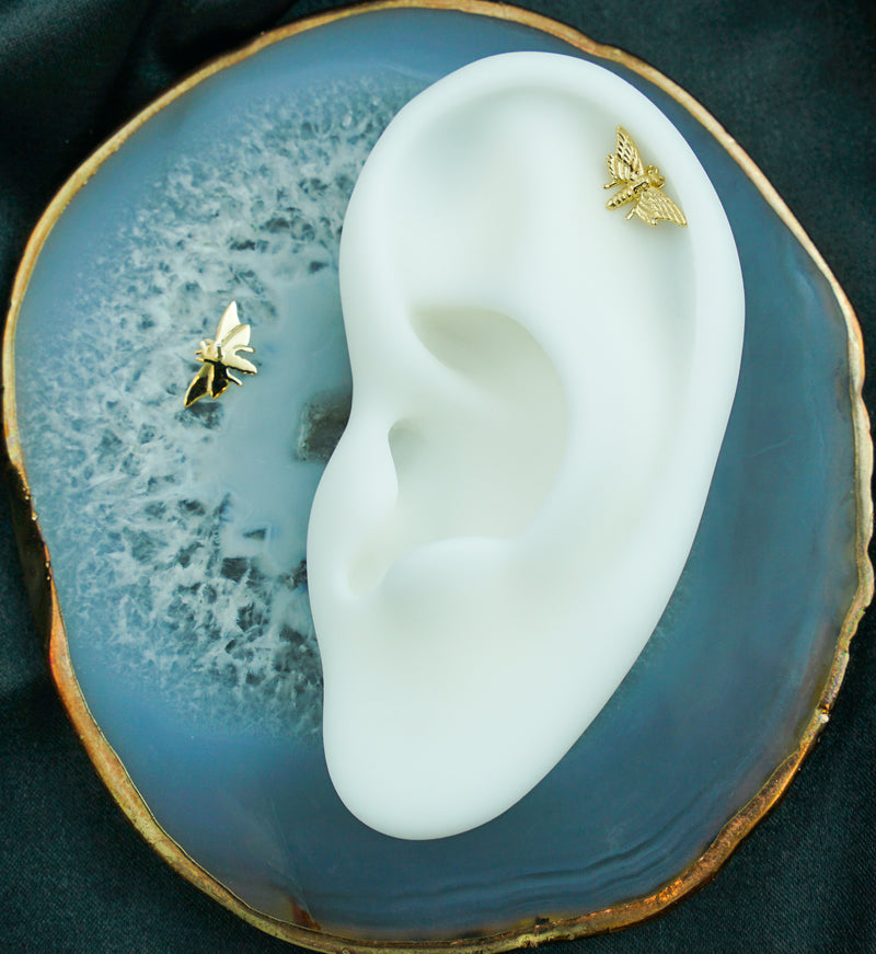 14kt nickel-free gold threadless top piece that has a death moth design. Pin size is 25G and fits most threadless posts. The size is about 12mm x 6mm. Cool top choice to add to your cartilage or tragus piercing! Sold individually (top only).