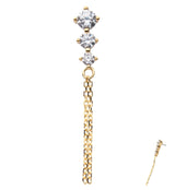 Made with nickel-free 14kt gold and a 316L stainless steel pin, this sparkling 11mm x 4mm (dangles:16mm) top features a secure 25G pin fit for most threadless posts. It has a triple, clear cz gem design in descending sizes with an attached, double straight chain dangle. Sold individually (top only).