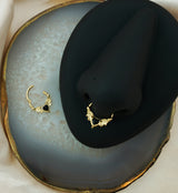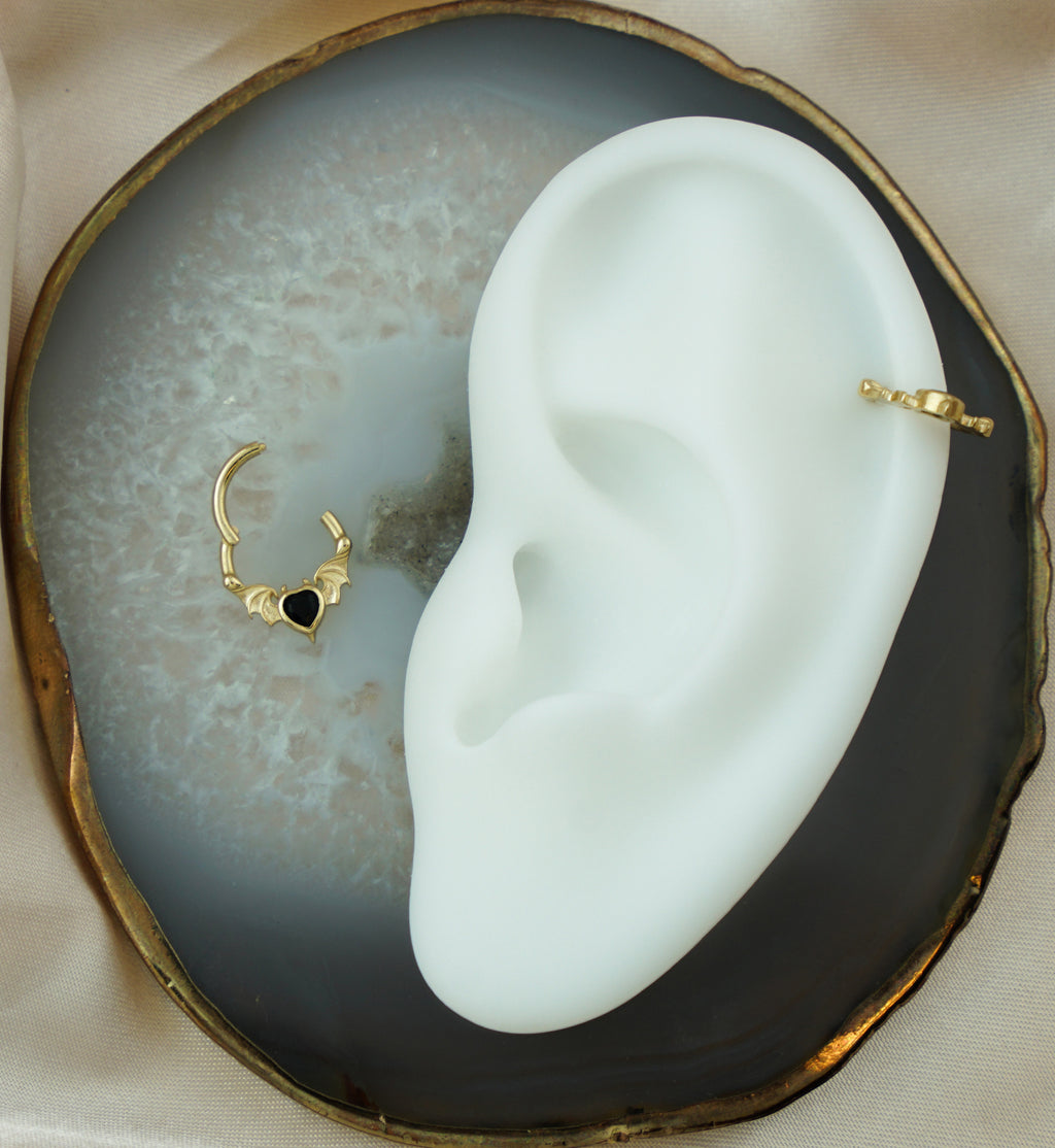 14kt gold hinged segment ring that has a bat wing design that is accented with devil horns as well as a heart-shaped, black cz gem at the bottom. Made from high quality 14kt yellow gold. Hinged style makes for easy to insert and remove. Size is 16G with an inner diameter size of 5/16" (8mm). Sold individually (1pc).