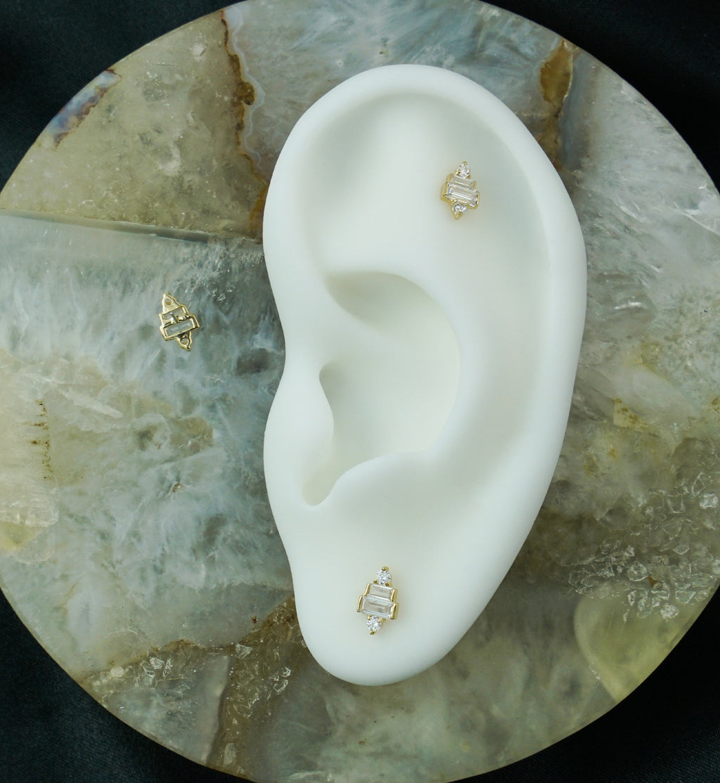 Made of nickel-free gold and a 316L stainless steel pin, this top is both stylish and safe. The top design measures 8mm x 4.7mm and is made up of baguette and round, clear cz gems. This piece is perfect for cartilage or tragus piercings. Sold individually.