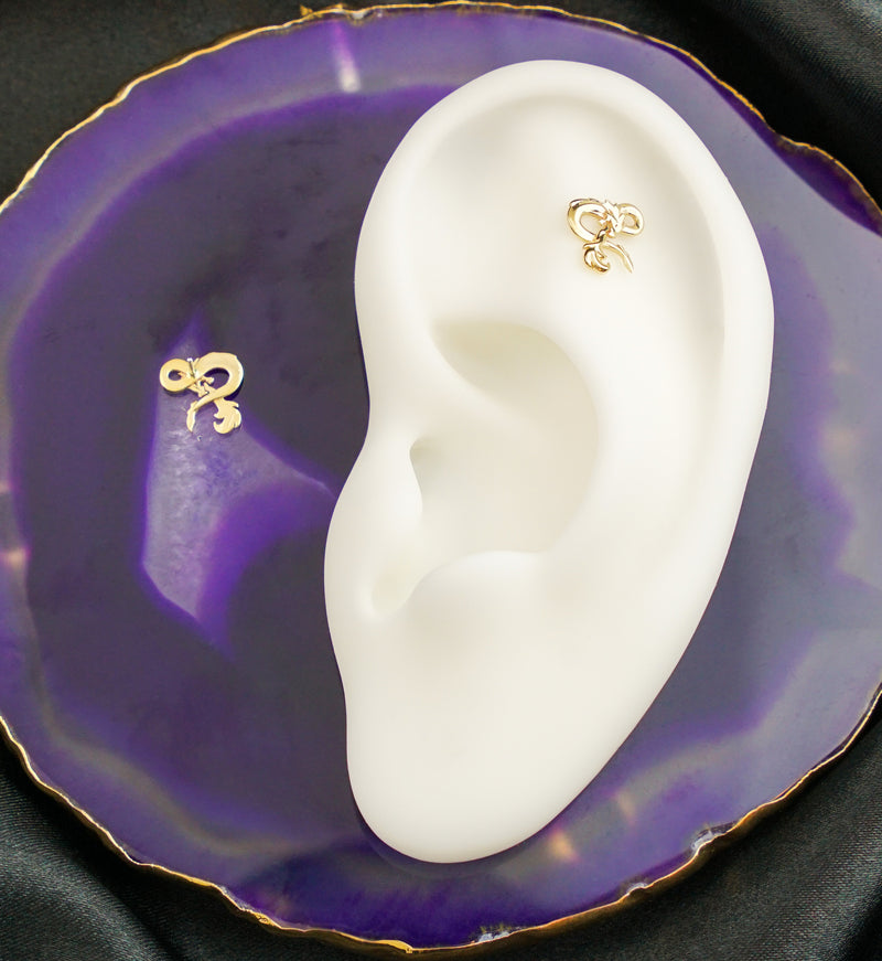 Threadless top piece that has the dungeons and dragons ampersand logo. Made from 14kt nickel-free gold with a 316L stainless steel pin. Pin size is 25G. Length is approximately 5mm. Top size measures at 8mm x 7.9mm. Sold individually (1pc-top only).