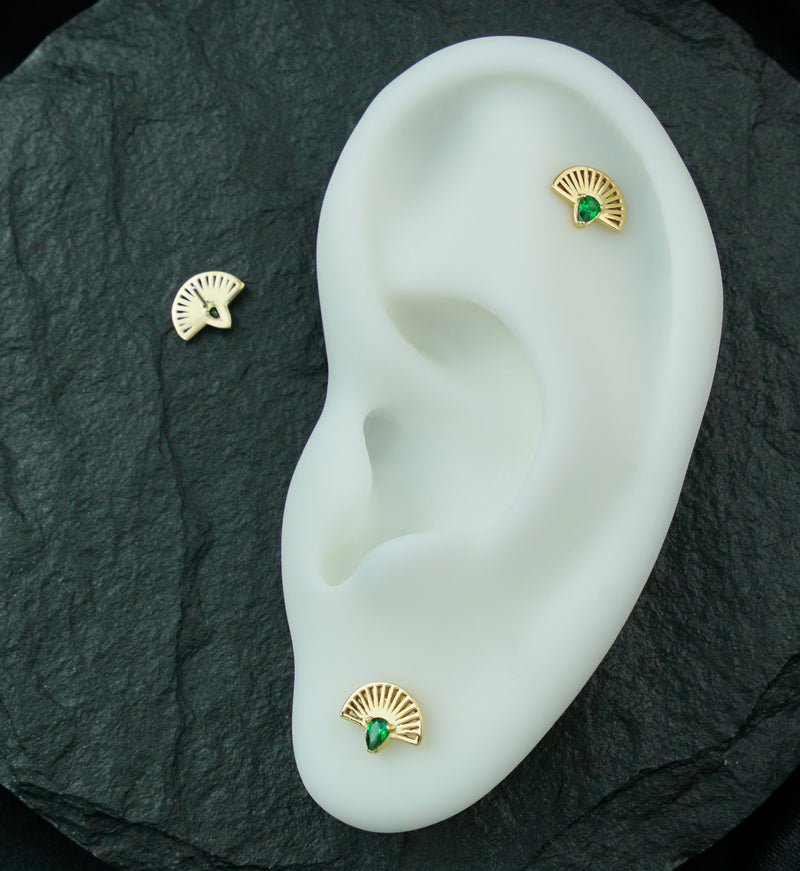 Beautiful threadless top piece that has a fan shape with a sunburst or sunray design coming from a teardrop emerald cz gem in the middle. Made from 14kt nickel-free yellow gold and a 316L stainless steel pin. Pin size is 25G. Length is approximately 5mm. Top size measures around 8mm x 6.5mm. Sold individually (top only).